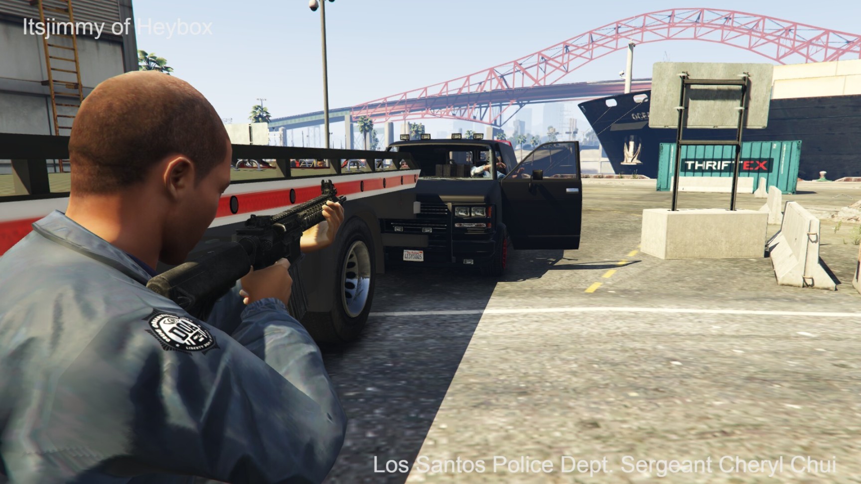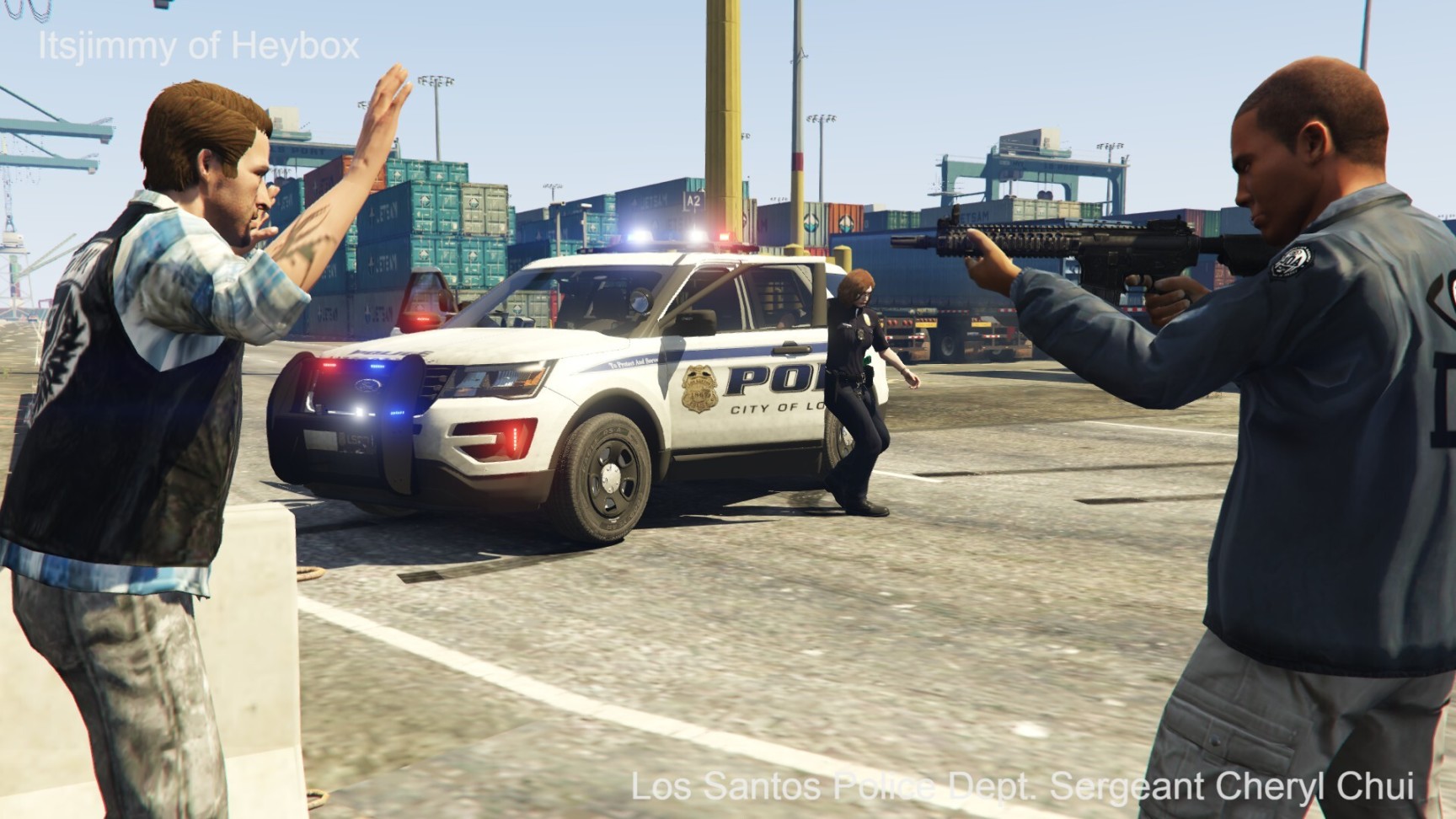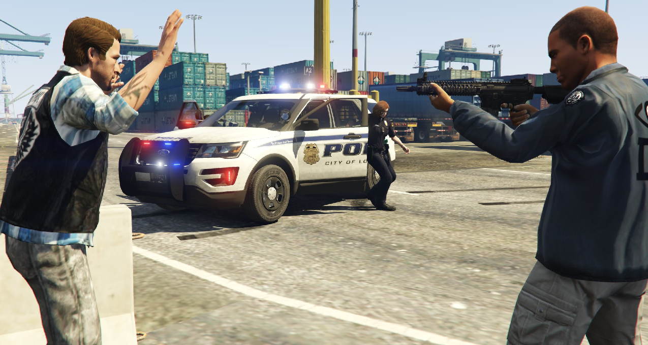 欧莉娅警员和卡尔德隆探员也跳下了车,和赶来增援的警员一起把失落摩托帮的喽啰们围了个里三层、外三层. 一时间,警员们手中的UPR[Urban Police Rifle,是LSPD为符合资质的警员配发的警用步枪]拉栓声音响成一片.
