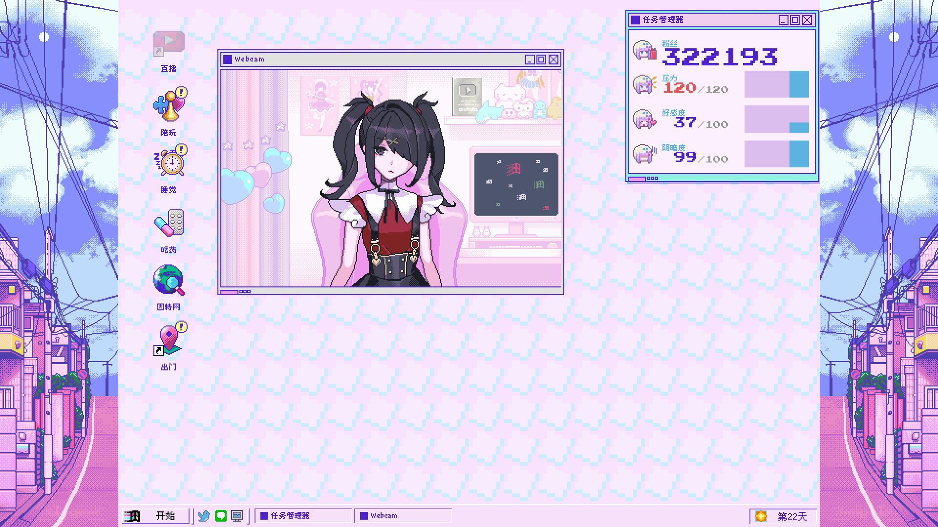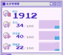 游戏中,时间随着玩家行动流逝。你需要安排她的日常起居,帮助她进行直播,达成她30天获得100万粉丝的愿望。对于游戏女主角,有“粉丝”、“压力”、“好感”、“阴暗”这4个数值。整个游戏的所有操作都是围绕这些数值变化而来,同时它们也影响着结局。