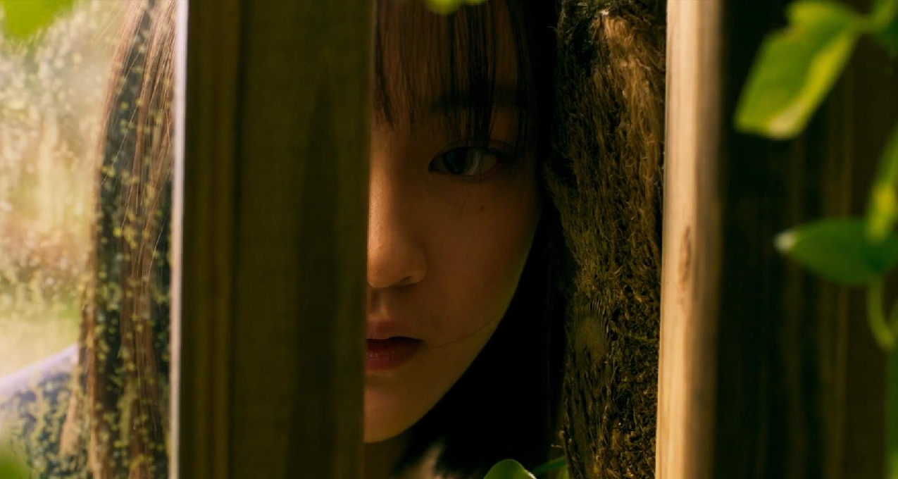 之后是玻璃上的倒影,那双腿是小女孩的。这里偷窥者又变成了小女孩,她看到一对男女在吊床上“聊天”。