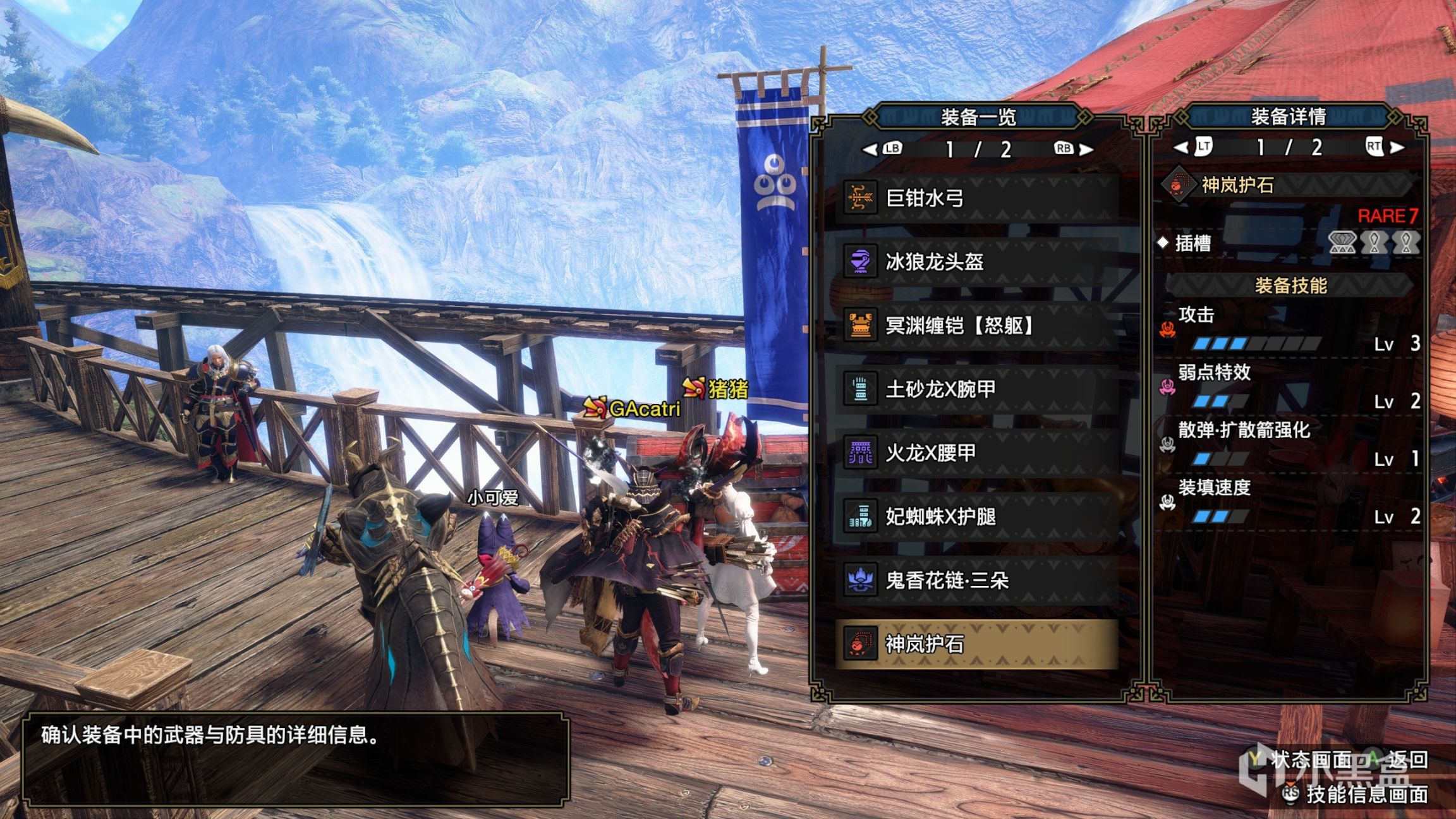 这把弓需要天彗的玉,我没刷出来,先用上位的代替一下。首先是体术2的配装,这把弓的情况和连射类似,如果不考虑战斗猫应该多出会心,可以把护石的三级攻击换成三级看破。