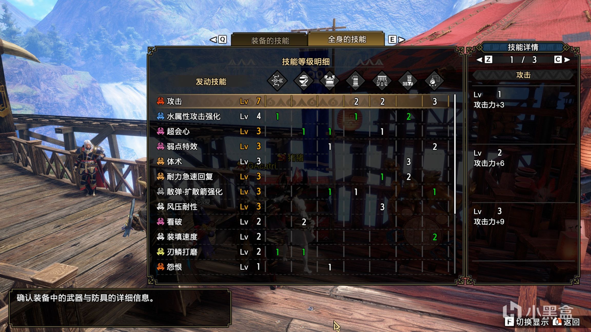 这把弓打的怪都需要弱特,例如霞龙。风神以及渊源雷神由于没有龙弓我也拿这把弓打。这把弓会心高,出攻击收益更高。这里我没强化满,凑活看。这里出到了体术3,所以猫饭吃3级体术团子。