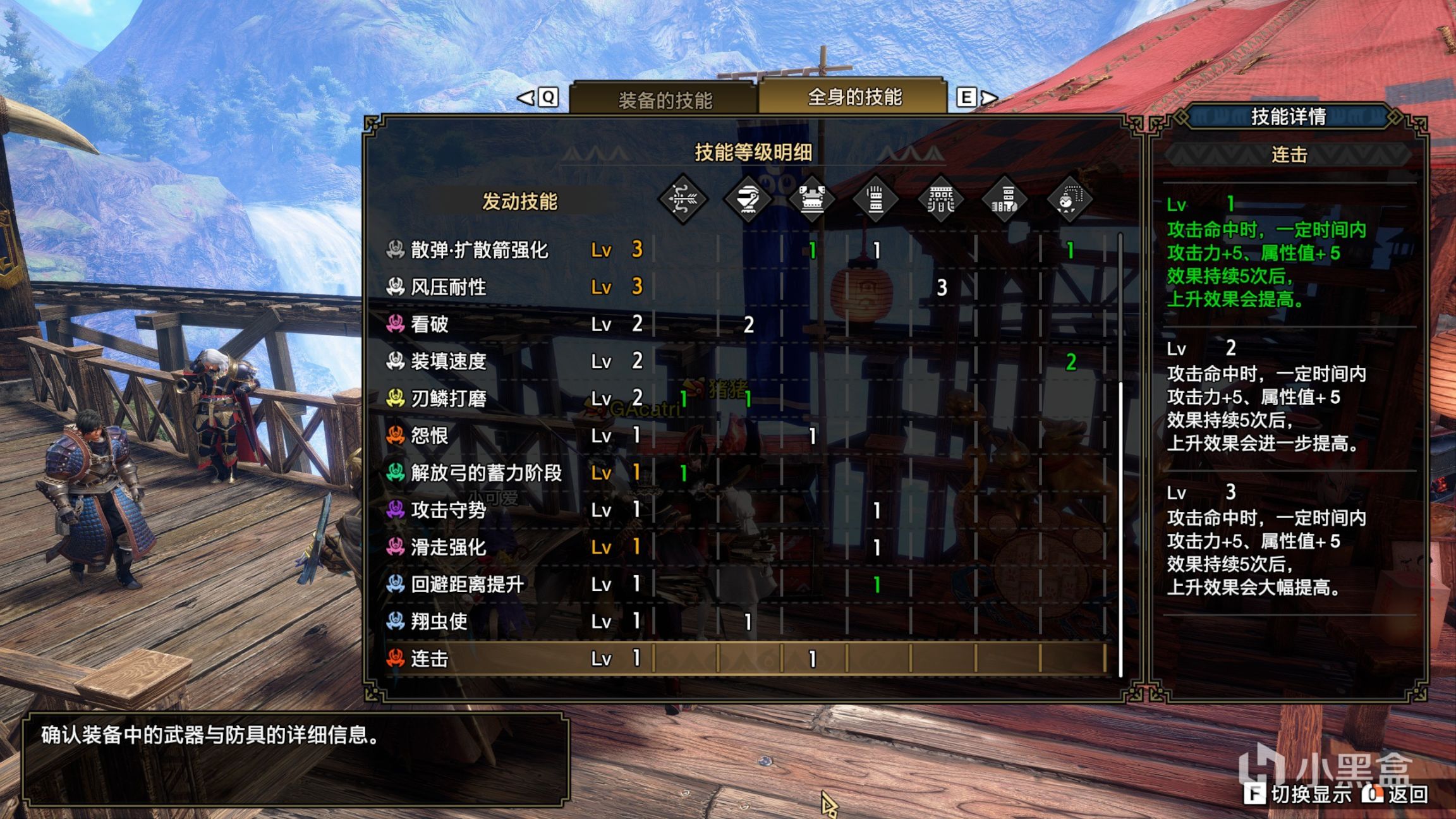 连射弓分为两类,首先是武器上有一个二级孔的模板,目前只有蛮颚弓。其余弓武器上只有一级孔或者没孔。首先是体术2的配装,这里蛮颚弓可以出到看破7,其余武器需要下一个看破的珠子只能出看破6。