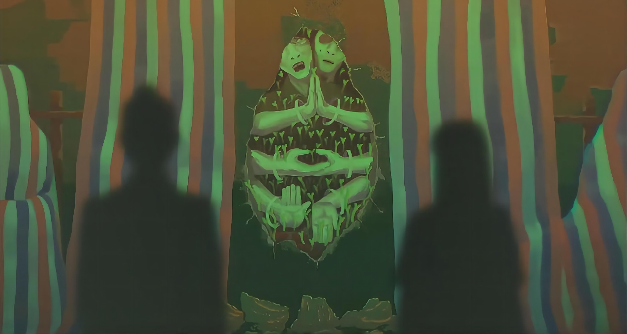 进入《三伏》,让人印象最深刻的体验莫过于“冲突”二字:绿绿的、潮湿的“电子包浆”美术画风,弘扬科学与封建迷信的交融,制度与私欲的交葛,时代群像在新千禧年的格格不入……这些物品、情节、人物上的冲突,无不凝练着令人细思极恐的可怖。