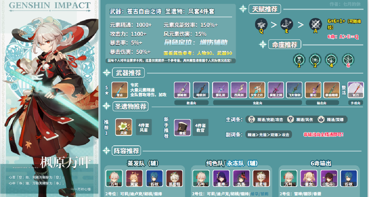 hello~大家好,这里是“七休”呀,时隔9个版本、一整年之后,「枫原万叶」终于迎来了他的第一次复刻!不枉大家苦等一场!这里祝大家一发入魂,保底不歪!本期带来的是「枫原万叶」配装配队的详细且全面的培养攻略!