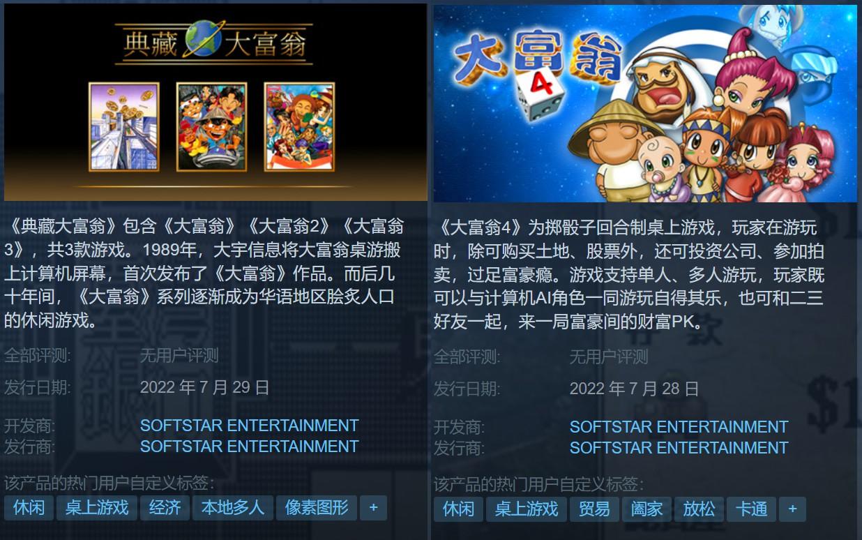 2019年的《大富翁10》是目前大宇旗下唯一一款登陆Steam的“大富翁”游戏。而最近,大宇在Steam上架了《典藏大富翁》和《大富翁4》两款游戏,并且计划在7月底正式推出。