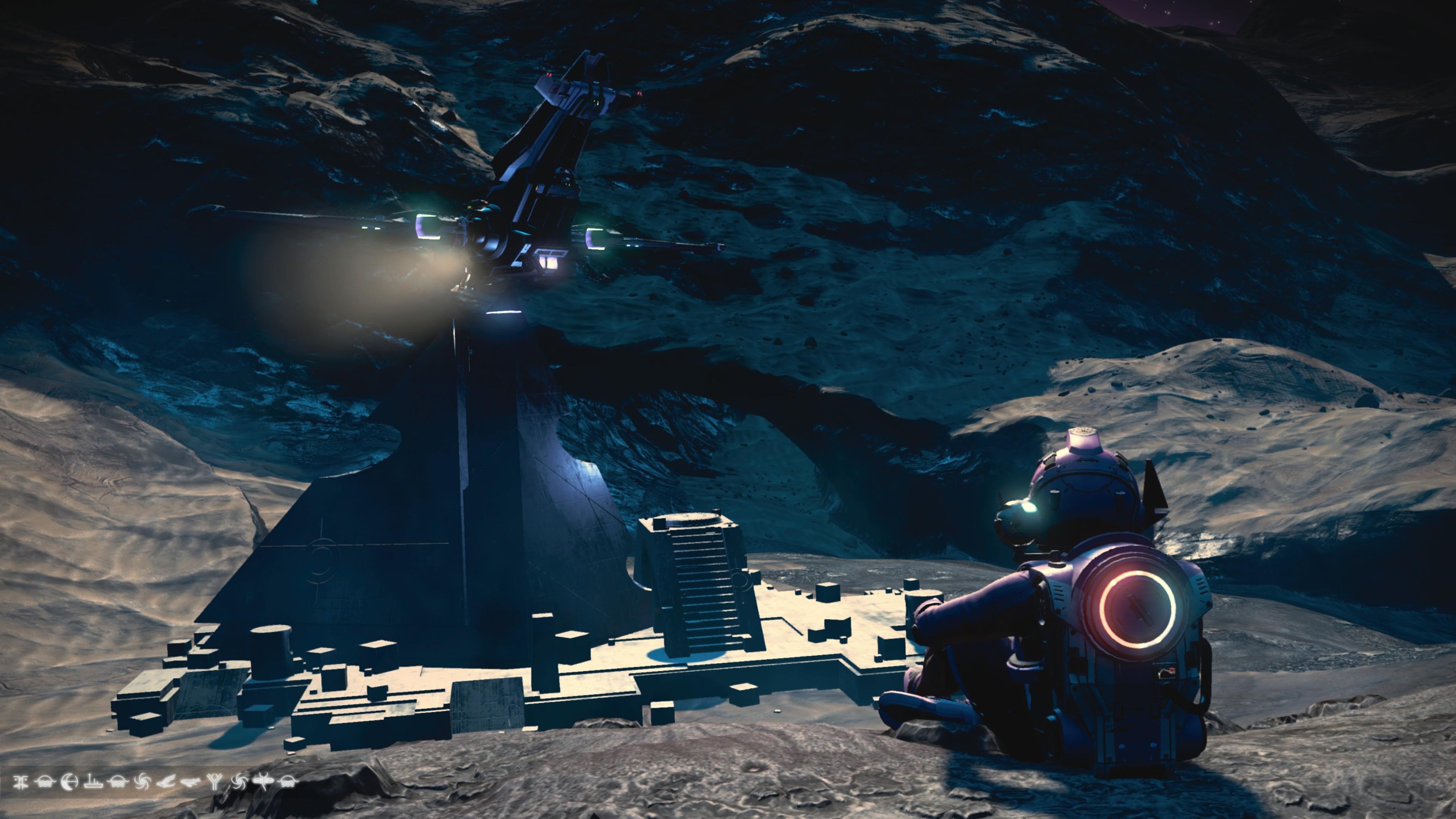 这张照片选自我刚开始游戏阶段偶然间发现的一个外星建筑,转了一圈没发现怎么互动,于是把飞船停在顶上,坐在一旁看看会不会掉下来。