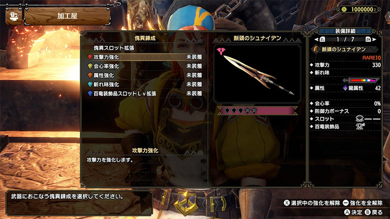据介绍,武器将会有五种强化方向,分别是攻击力强化、会心率强化、属性强化、斩味强化和百龙孔插槽扩充。
