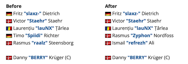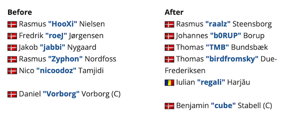 作为丹麦的新星队伍哥本哈根火焰Copenhagen Flames已经取得了巨大成功,创造了Hooxi转会G2,jabbi转会Heroic等成功案例,如今他们希望复刻之前的经验。由birdfromsky领衔的阵容是否会能够打出局面还有待商榷,但是大多数选手还是能够保持自己的优势。Copenhagen Flames也算是从自己选手中受益最多的俱乐部了。