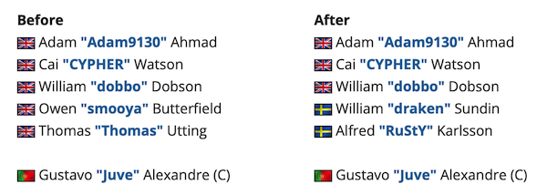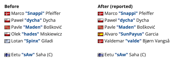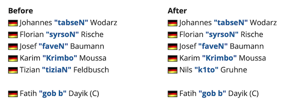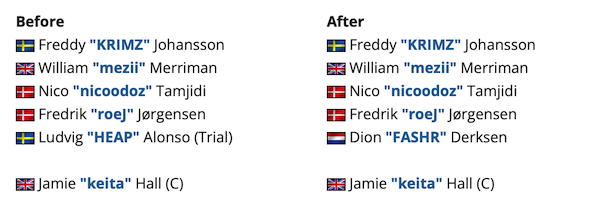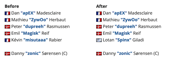 Sprout在这个休赛期中也产生了巨大的变动,他们的稳定的首发选手Spiidi和raalz选择了离队,于是俱乐部引入了来自Copenhagen Flames的Zyphon和来自Heroic的refrezh,而refrezh也将在队伍内第一次担任IGL的角色。Sporut从原来戏称的BIG德国青训到现在引入丹麦人之后成为国际纵队,这样的变化是否能够让他们从欧洲二线队伍中脱颖而出呢?一切都将留给时间。