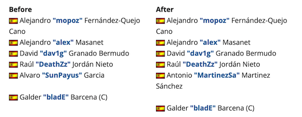 Movistar Riders为今年上半年开启了一个梦幻般的旅途。他们在ESL挑战者杯瓦伦西亚上闪电般的崛起,IEM科隆又闯入四强。然而他们的成功很大程度上要归功于他们的明星狙击手SunPayus。随着大哥离队,Movistar Riders启用了23岁的MartinezSa,但是他的实力着实欠缺,在HLTV的数据库中也只记录了44张地图。从西班牙队伍直接淹死在首轮的欧洲区RMR海选来看,Movistar Riders的情况将非常糟糕。