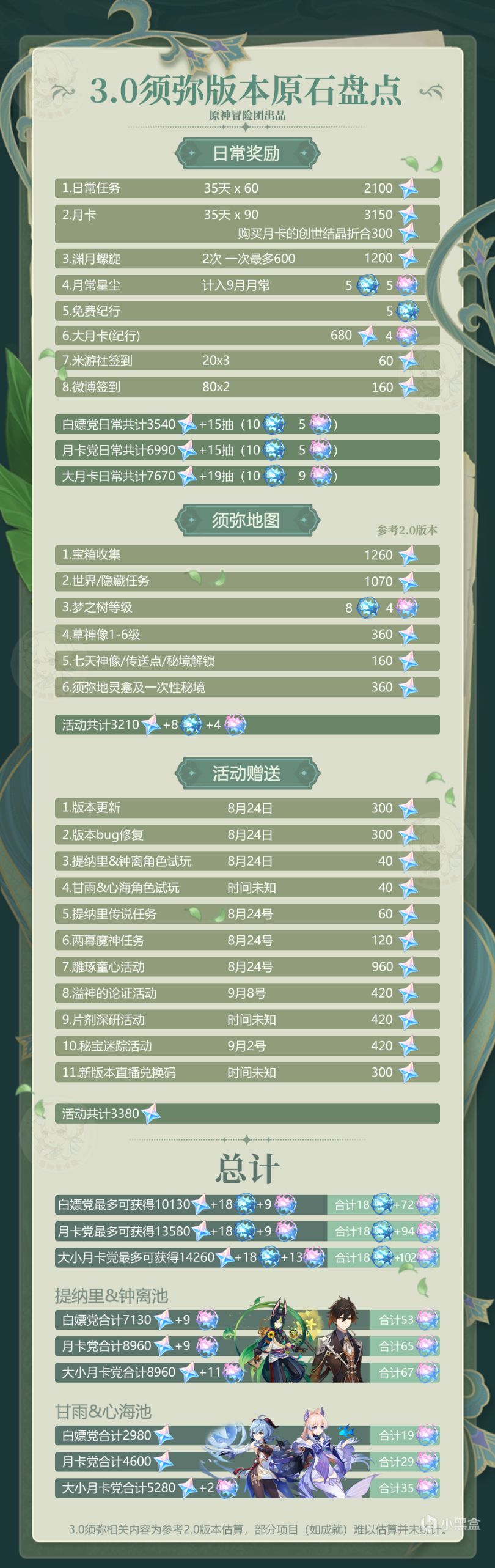强调:3.0版本的须弥的内容根据2.0版本的稻妻情况进行了估算,而且未知成就等难以统一的部分未列入表中,所以预计大家实际能够获取的原石数量会比统计数高一些。