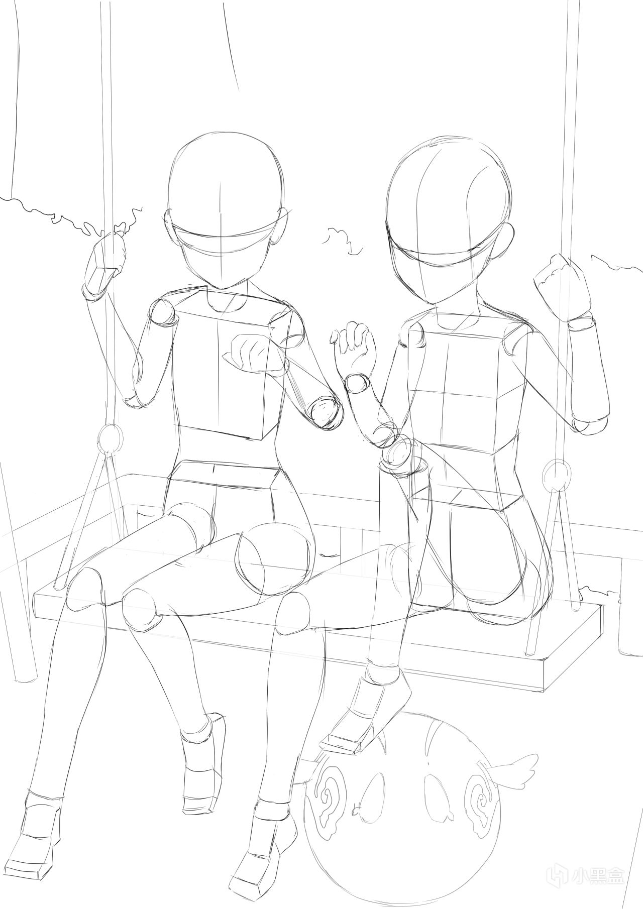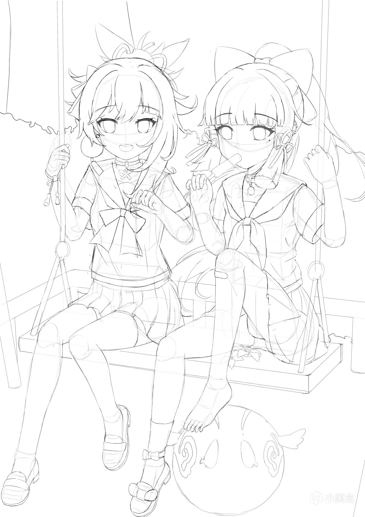 第三步,在人体结构的基础上把宵宫和绫华衣服饰品及五官都画了出来,为了让观图视觉更集中在人体上,稍微把人体调整拉大些,这步骤是草图阶段。
