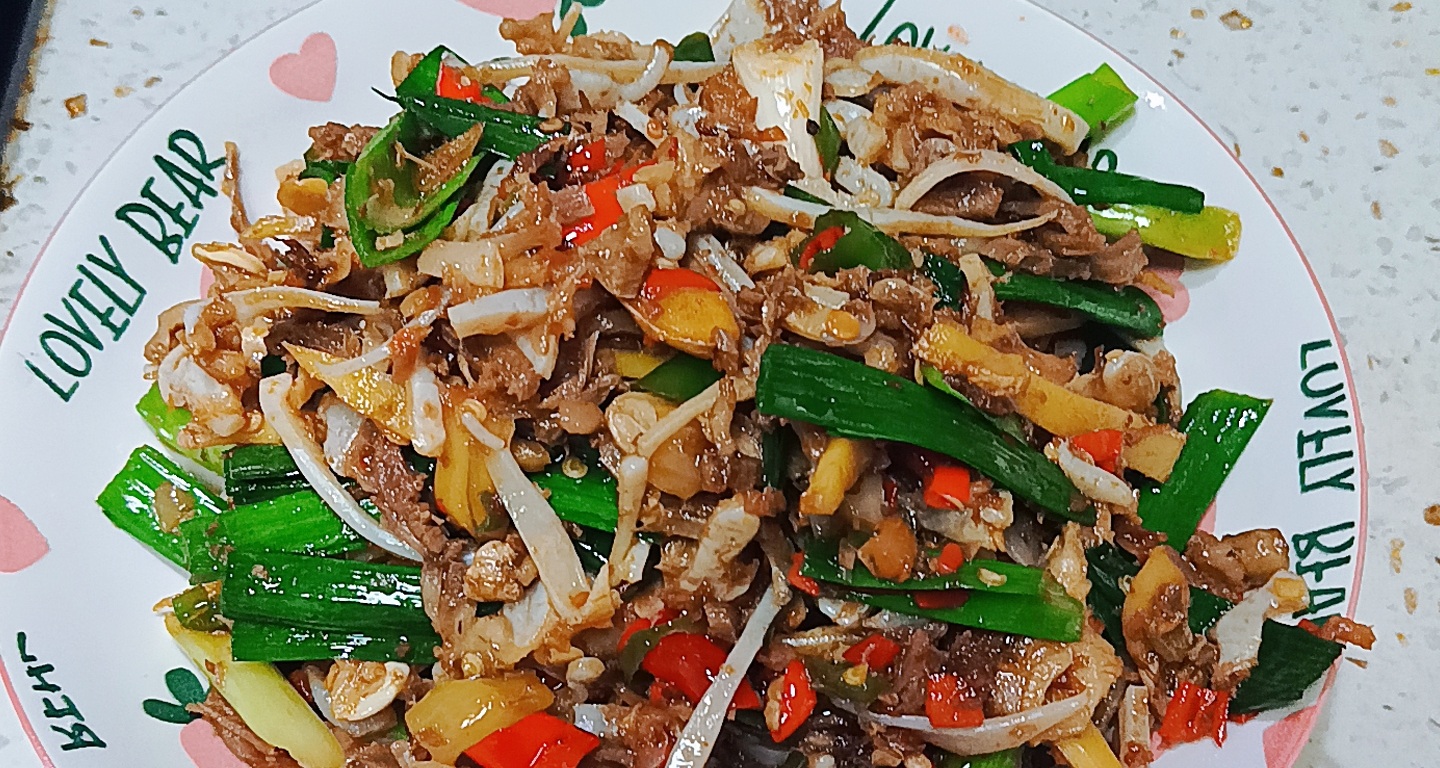 炒脆骨剩下来的油,把辣椒➕姜丝炒香,放少量盐,增加底味,放入炒好脆骨【中小火】