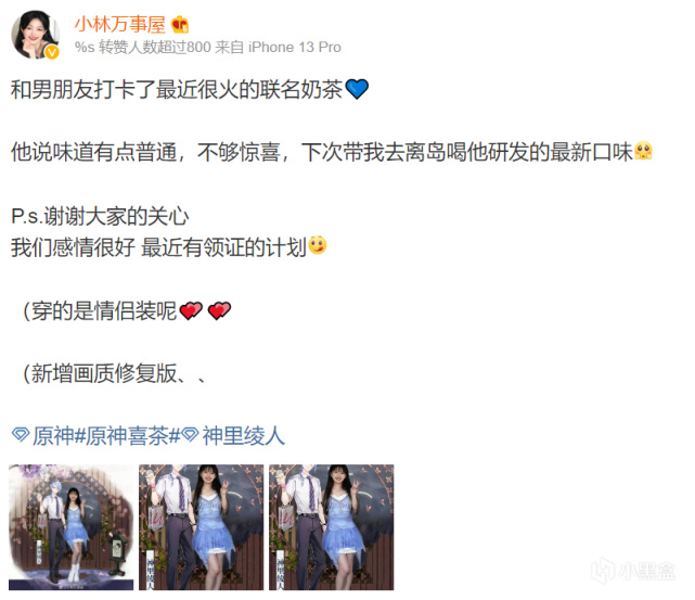 除了晒获得的周边产品之外,有的玩家还脑洞大开,将神里绫人是自己男友的“美好幻想”作为既定事实进行日常演绎,十分有创意;更有神级旅行者在喝茶的同时,还精心COS出了神里兄妹的联动造型,让人直呼“次元壁又破了”。
