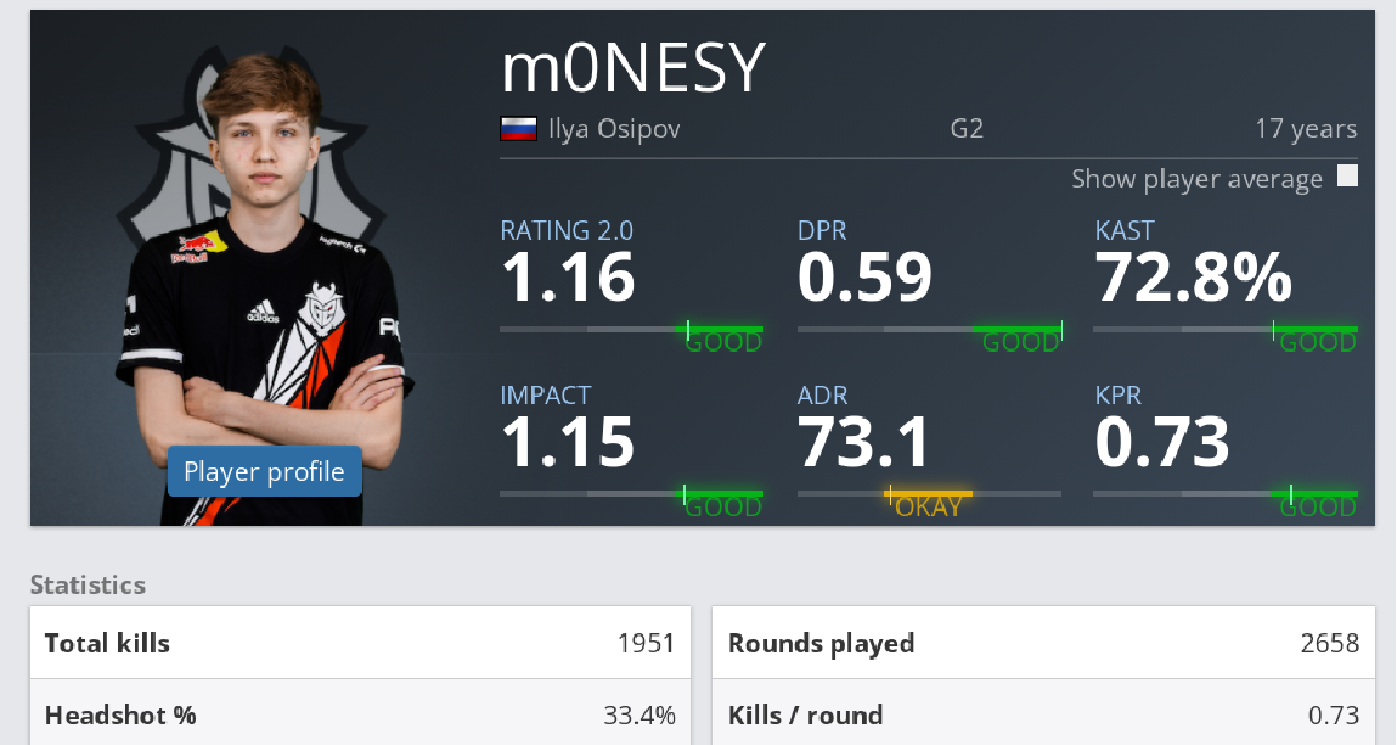 Ranking Filter(排行筛选):这是HLTV的一个数据筛选标签,同样你可以手动筛选该选手对阵不同级别队伍时的数据,不只是rating。