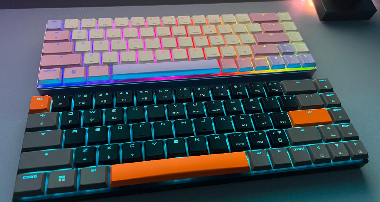 因为是矮轴+矮键帽组成的纤薄机身,所以键盘设计上是没有收纳仓的,两款键盘的键帽都是传统的 ABS 镭射雕刻工艺,缺点很明显就是长时间使用容易打油,但是字符是透光的,喜欢 RGB 的朋友肯定开心。