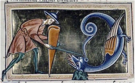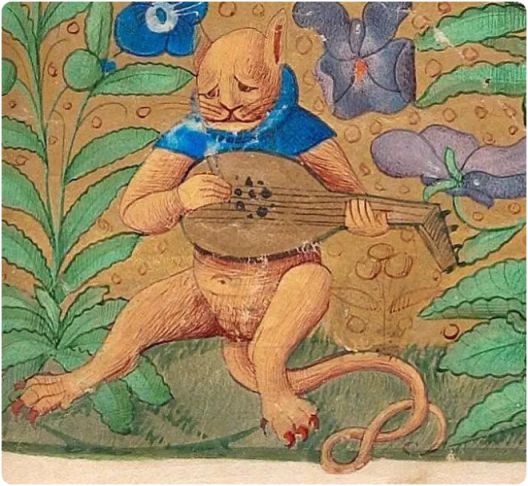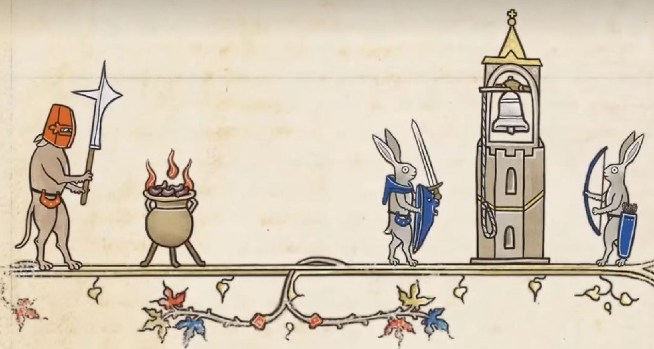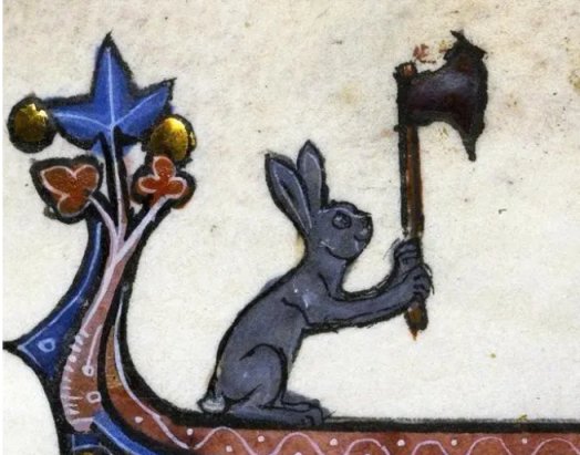 本作的灵感来源于七百多年前欧洲中世纪宗教典籍中页边的那些稀奇古怪的“动物”插图。推特上有个叫作@weird medieval guys的账号就专门分享这类怪东西。你永远也不知道在那些看上去很正经的文献里会生长出什么样奇形怪状的生物。像下面这只拿斧子的兔子,可能是其中最正常的一个了。