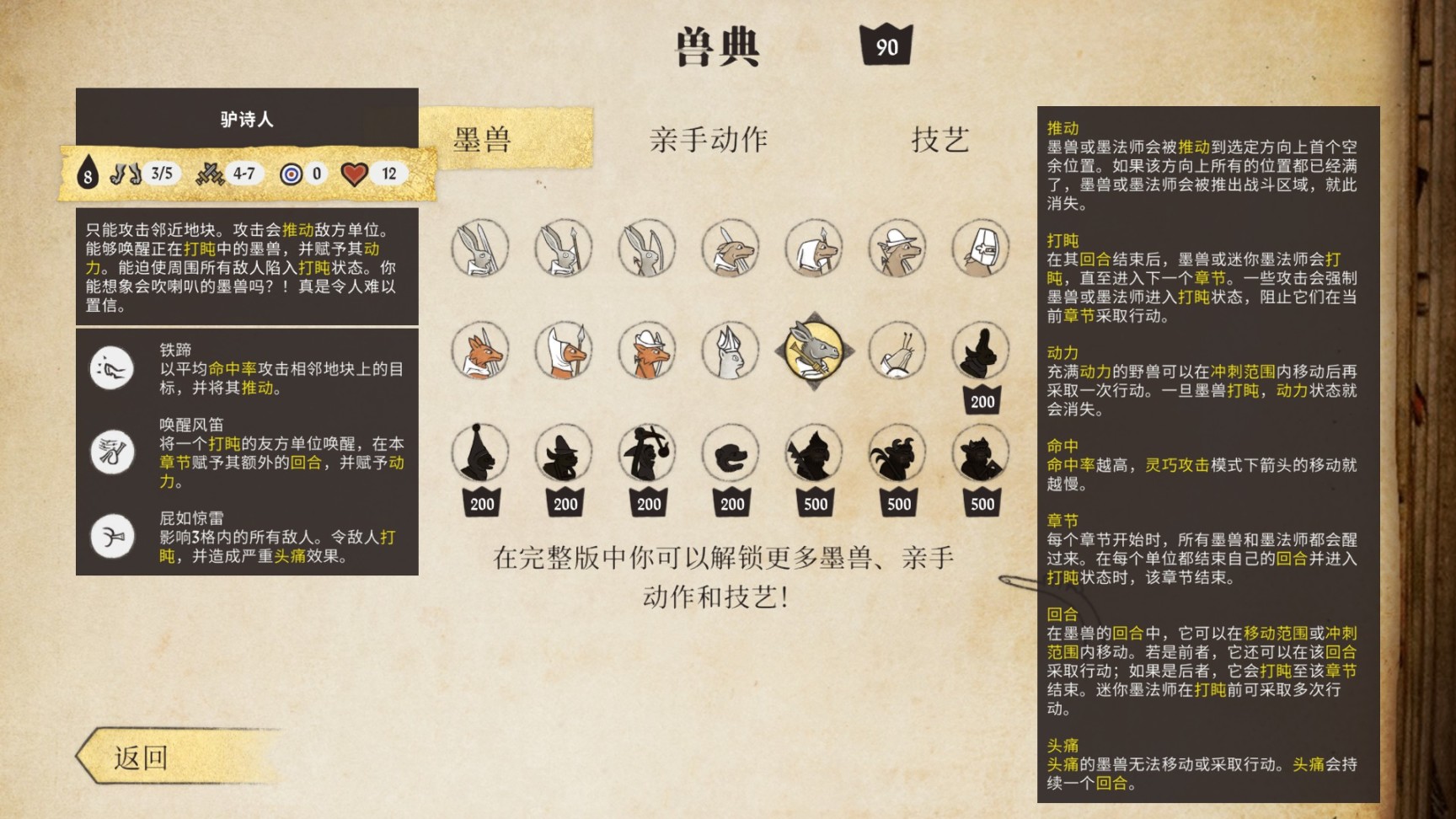 在游戏中,一开始我们能见到的,还是一些比较常规的狗、兔子、狐狸之类,但很快也能看到“驴诗人”这种屑东西。随着游戏进行声望提升,后面也会解锁更多的兵种,而正式版本中还将会加入更多的墨兽——截图中大家能看到的这些,就不过是冰山一角了。像蜗牛公鸡、鸡蛇怪这些怪物,想来也是有出现的可能呢。
