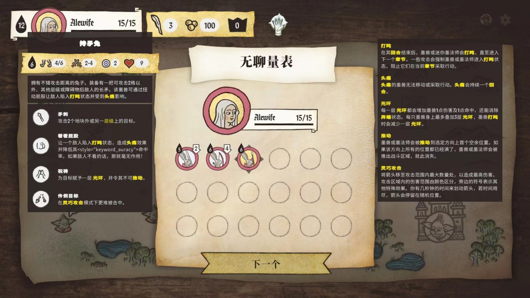 所以说,尽管表面上看起来区别不大,但有无墨法师在场的对战,实际上几乎算是两种完全不同的玩法。有墨法师的对局,玩法类似于战棋+卡牌,相对而言可能简单一些,或者说容错率高一些,游戏的“决斗”模式采用的就是这个玩法,玩家可以和电脑或是身边的朋友同屏联机进行1v1的battle;而没有墨法师的对局,玩法则更像是解谜,很多时候优解的选择范围很狭窄,稍有不慎操作失误就会被AI一套combo连得怀疑人生,几个教程关更是基本上只有一个唯一解。如果选择较高难度进行游戏,还是相当具有挑战性的。