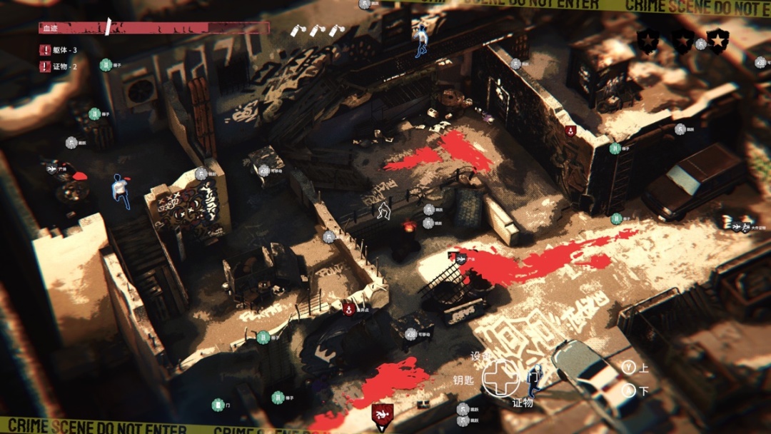 游戏闯关主要以“躲避警察”为前置条件,一经发现玩家他便掏出警棍,在你头上来上一下,将你绳之以法。当超过3名警察发现玩家身形时,就会淘枪“实施强制执行”。玩家可以通过(潜伏、躲避、击晕、引诱、快速通过…)多种方式结合与警察来一场脑力上的角逐。在运送证物、尸体的过程中往往因为目标过大、遗漏身型被发现,所以玩家要善于利用技能能力来实现搬迁成功,而地上的大片血迹可以在快速经过时,同步进行有效清理,这也是为了缩短游戏时间。在闯关的过程中并没有实质的激励,更多的是剧情碎片上的额外补充,以故事剧情增加游戏粘性。也是为什么玩着玩着天就黑了的原因…其次在“运送证物、尸体”难度上基本不大,玩家要善于运用场景内的道具,搭配伴生技能基本在闯关过程中不会有很大问题……