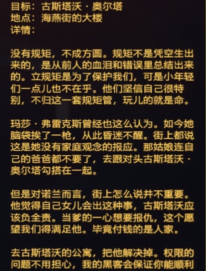 ⑧:委托任务要求杀掉某人时,一定一定要选择打晕(怕打死的用带有非致命插槽的枪),会有后续要求你把人扛出来,然后装车里送给委托人处理(个人觉得这个最好,简单打死太便宜了。但也有可能中间人会不杀死目标,而是会像瑞吉娜委托任务《警察靠的住,母猪会上树》一样有了他的把柄,把目标作为傀儡掌控之类的,后期去酒吧还能遇到他进行对话)其中最糟心的是神父的一个委托任务目标-古斯塔沃,在《再见杰克》里可以得知他是杰克从小认识的朋友,这个任务最糟心的是哪怕你选择放过他,他最后也会选择自杀
