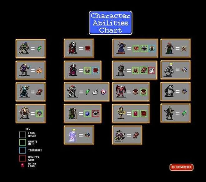 游戏中有大量可解锁或收集的内容,包括人物、装备、成就等。不同人物的自有武器不同、人物的加成buff也不同。