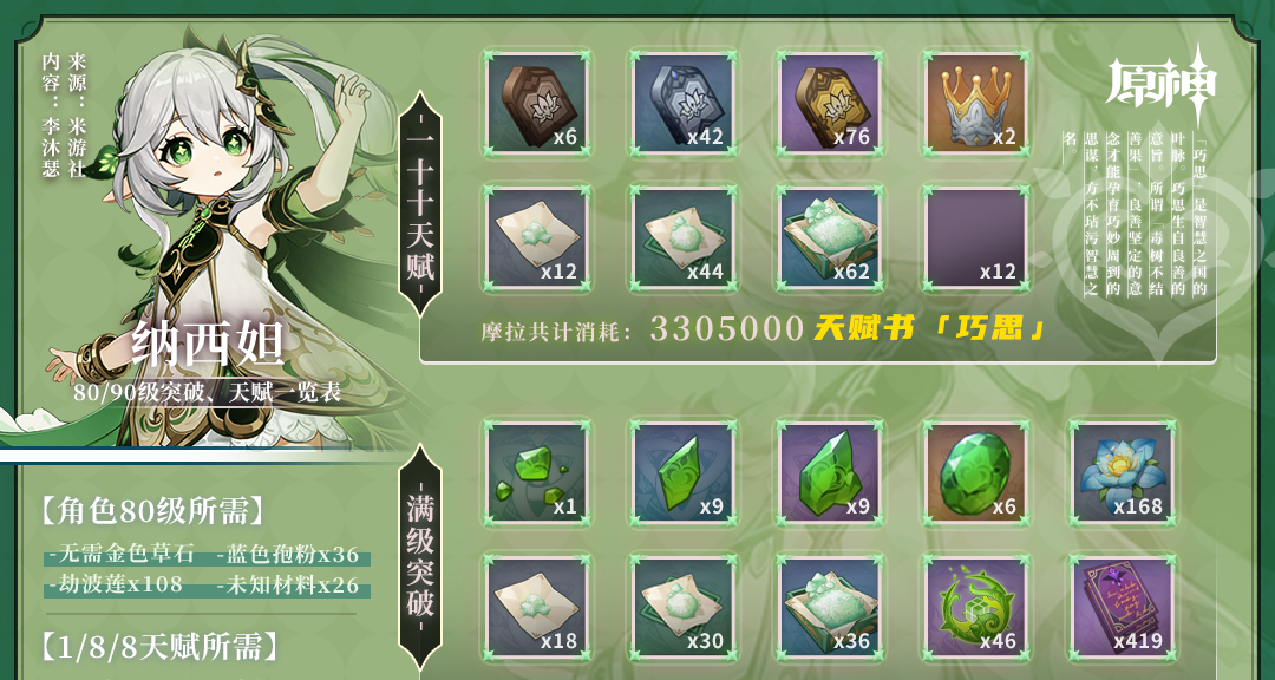 首先先浏览纳西妲的《养成所需》↓(五星草系输出)