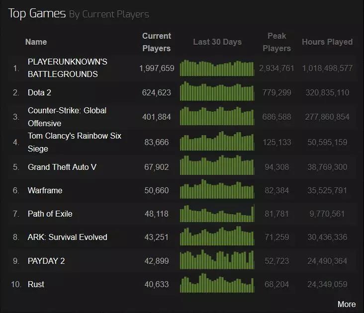 根据第三方统计平台Steam Charts数据显示,截至当前,《绝地求生》依然保持近30日在线游戏人数第一的排名,用户近30日的游戏总时长甚至等于榜单上包括Dota2在内的第2-5名之和。