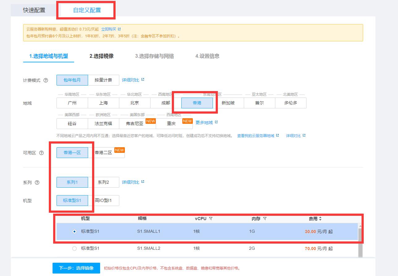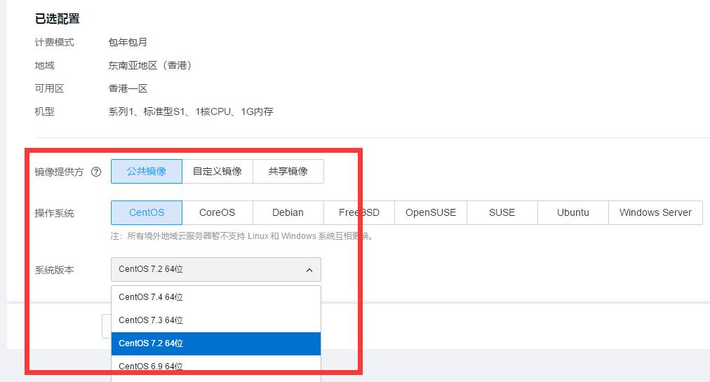 立即选购,自定义配置,亚服就选香港,看个人需求,系列机型选第一个就好,系统选下图随便一个即可。
