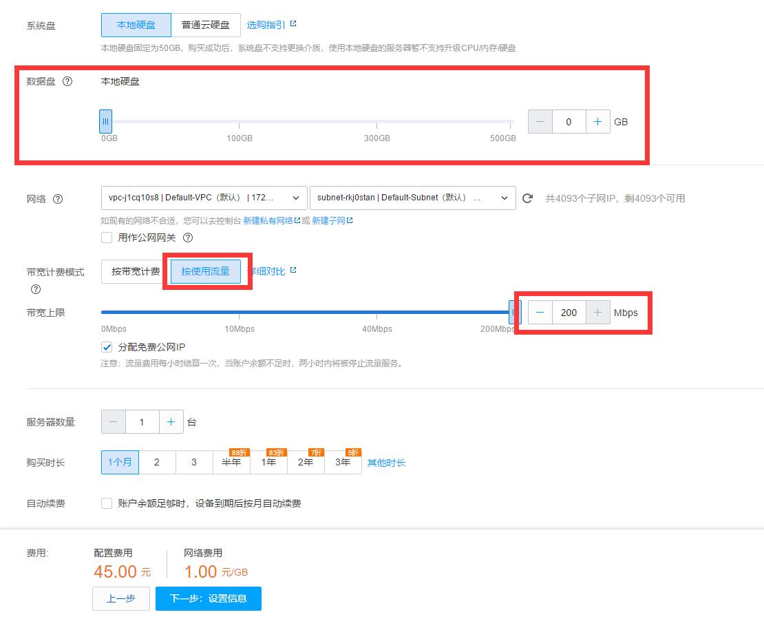 到选择存储与网络后,因为只是用于加速器。所以数据盘选0G,宽带最高,按使用流量,其他默认。