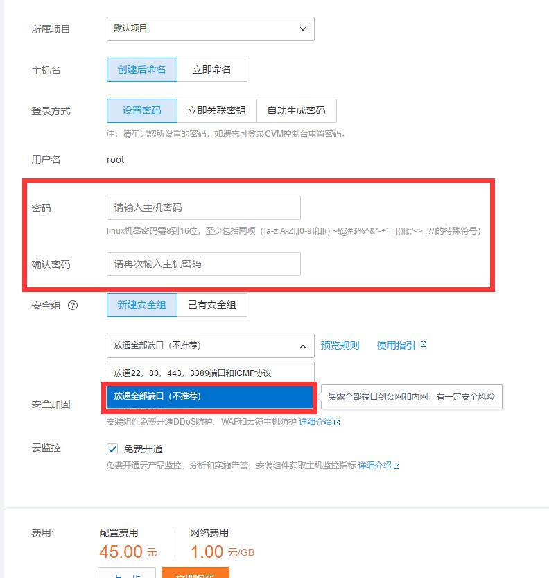 下一步设置信息,设置自己的服务器密码,一定要记着,端口选择全部开放。
