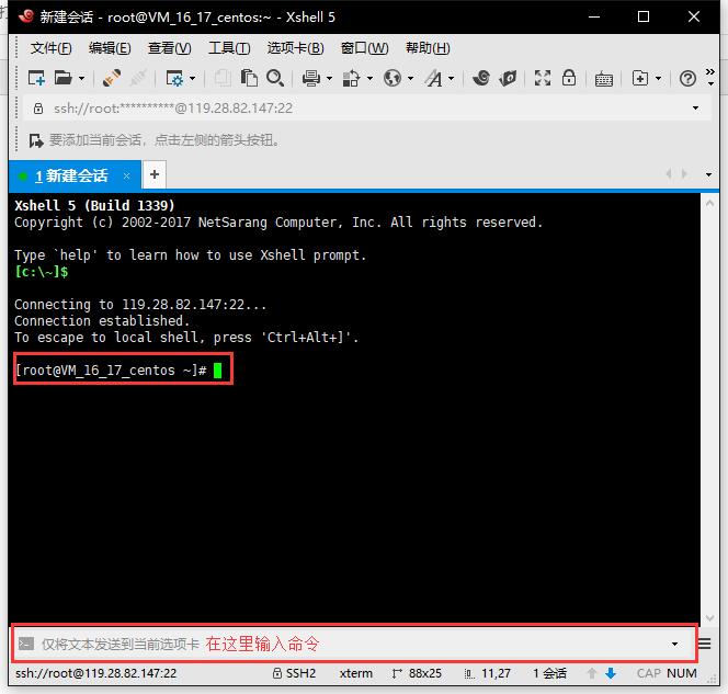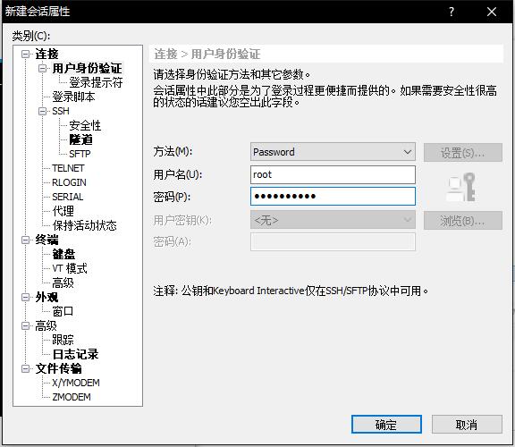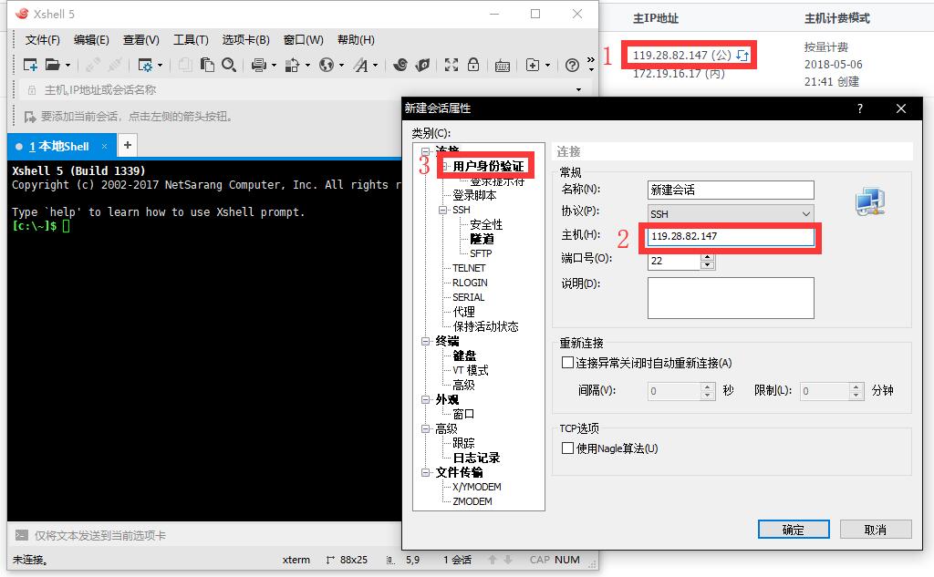 打开Xshell软件登录自己的服务器,帐号是root。密码是创建时候的密码,其他按照下图填写。