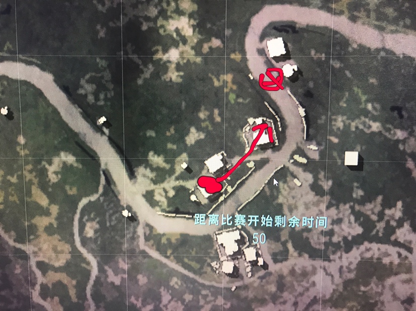 落这里的人我不知道为什么都爱落炮楼那边,如果敌人正好在那里的话,我们可以有枪以后就在图上手指指的地方守株待兔(厕所旁边有个小墙),等着他搜完炮楼跑过来就好(这时候楼主的视角就等于我说的敌人视角)。