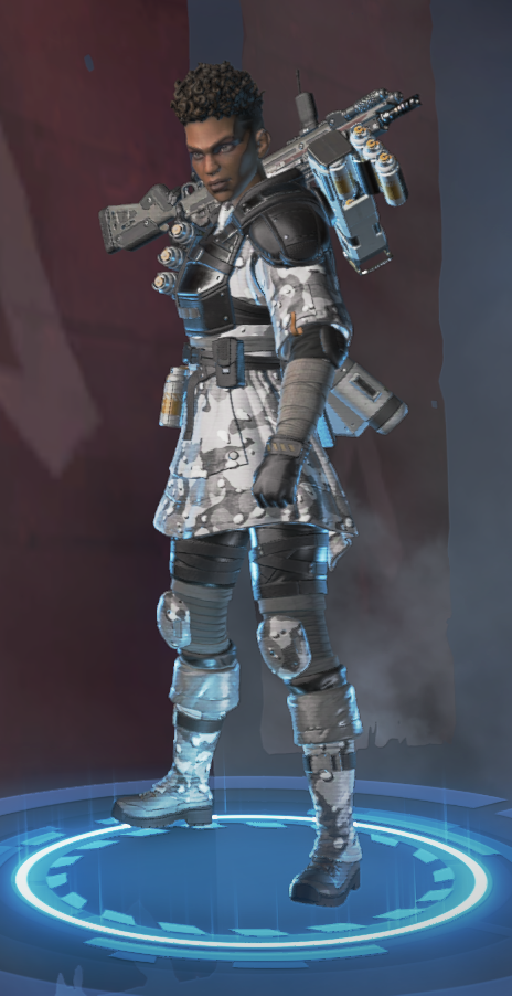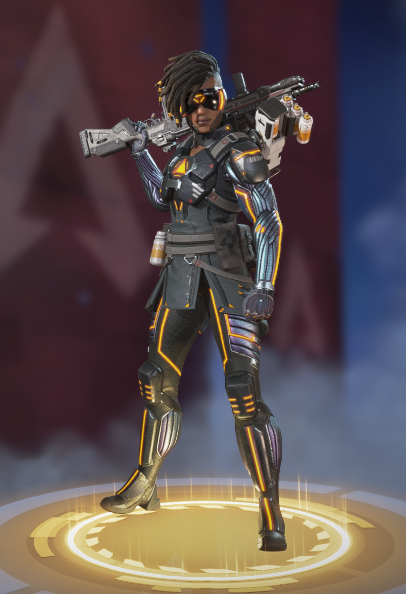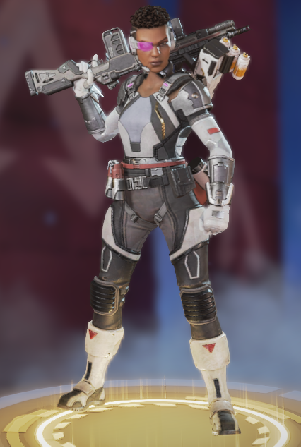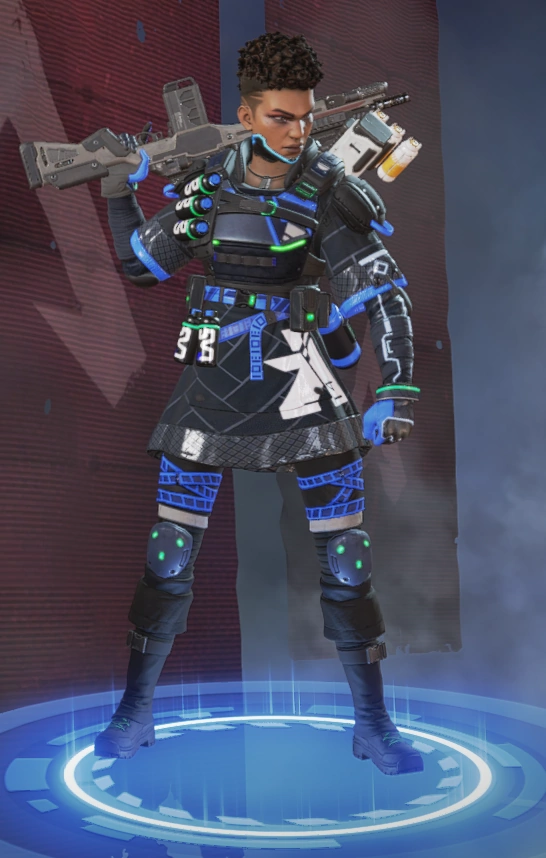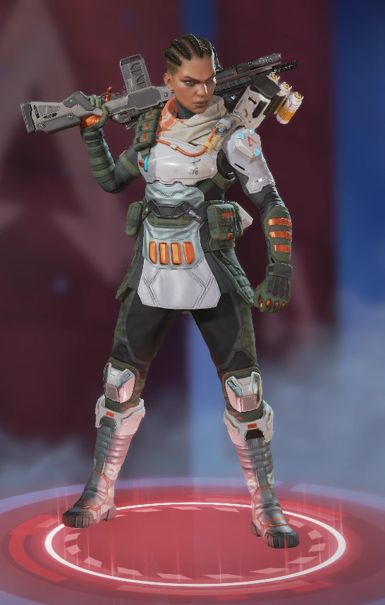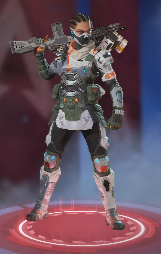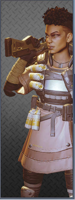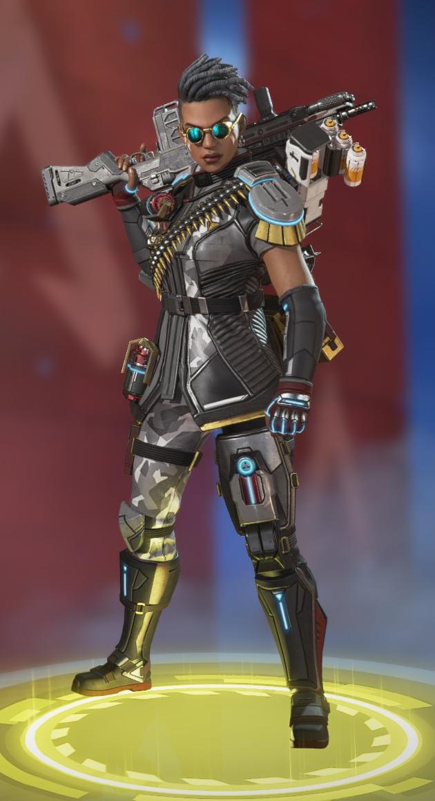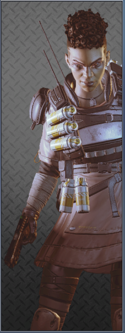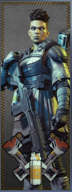她的烟雾发射器可以储存两发,释放后在撞击时爆炸形成烟墙,类似于各类射击游戏的烟雾弹,她的主动技能可以说作用很大。她的绝招跟直布罗陀的很像,战略的意义大于对敌方造成伤害,封锁一片区域十分有效,大招会造成严重的减速及视线模糊,友方只会承担减速和模糊的效果,在敌人被班加罗尔大招控制时,仍可主动进攻取得优势。