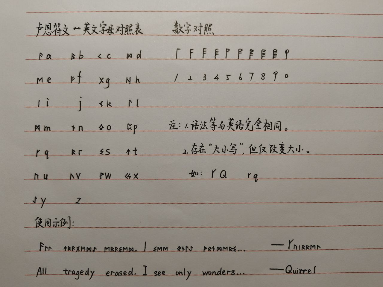 首先,是 @Malfeasance 发现的,其实就是卢恩字符和英文字母的一一对应,使用时的单词拼写、语法结构等与英语一样,没有什么特殊的。