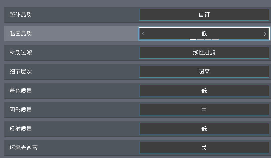 你能直观感受游戏里大部分浮雕贴图和模型表面的外观品质。低失真较为严重,尤其体现在枪的皮肤上,纹理几乎没有;中可以体现大部分纹理;高的还原度非常好;极高在没有超清DLC和4K屏幕下和高差别不大。此选项对帧数影响一般,高以上对帧数影响明显。建议中。