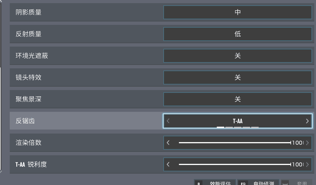 同分辨率下对帧数影响最小,应该说是能提升帧数,比关闭还要有更高的帧数,比关闭有明显的提高。渲染倍数右边有数值,和你显示器分辨率正好就行,低了画面会严重模糊!高了,,,它最高才1080。TAA效果就是图像特别柔顺,流畅,没有锯齿,没有闪烁。