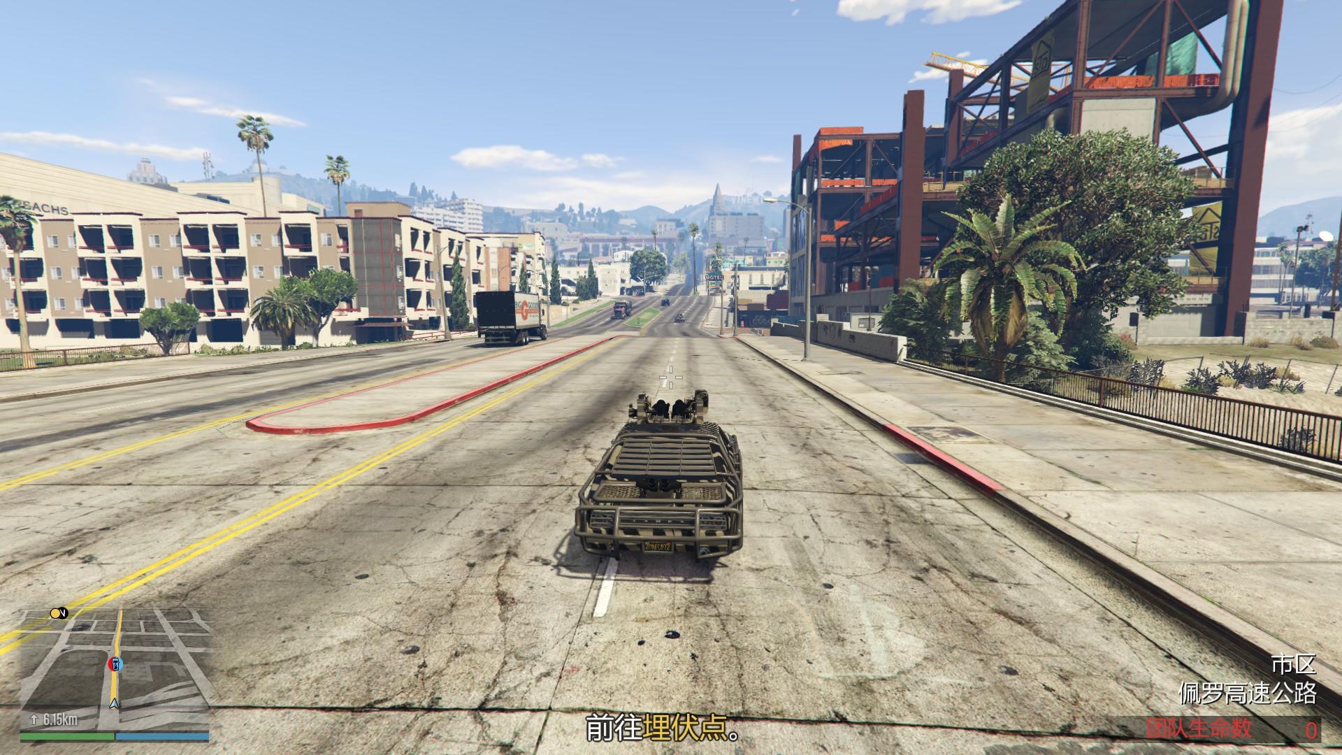 任务开始从公寓出来四个队友开着骷髅马或其他武装载具前往黄点任务位置摩托帮位置。