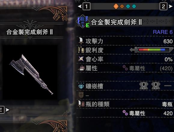 所有近战武器的毒属性和爆破属性一样,均为面板的10%累加毒属性,目前累加值最高的系列为毒妖鸟衍生,最高面板达到540;比较特殊的为斩击斧的合金制完成剑斧Ⅱ,面板理论值高达840,实际上只能累计其中的一部分,解放时累积的是瓶子的属性,普通攻击累积的是面板上的属性,两者都是概率附加。