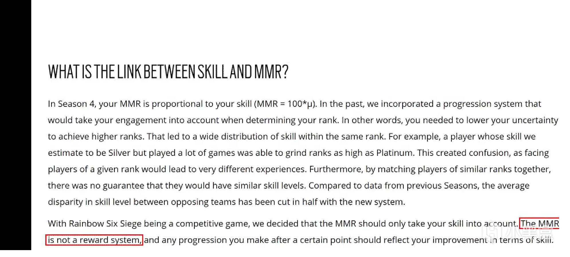 然而实际上育碧却说一套做一套,将玩家的赛季奖励和段位挂钩。事实是,mmr不应该直接和排位等级挂钩,mmr的作用是帮助系统匹配到水平更接近的玩家,而并非作为一个玩家真实水平的数值,更不是一种奖励机制。