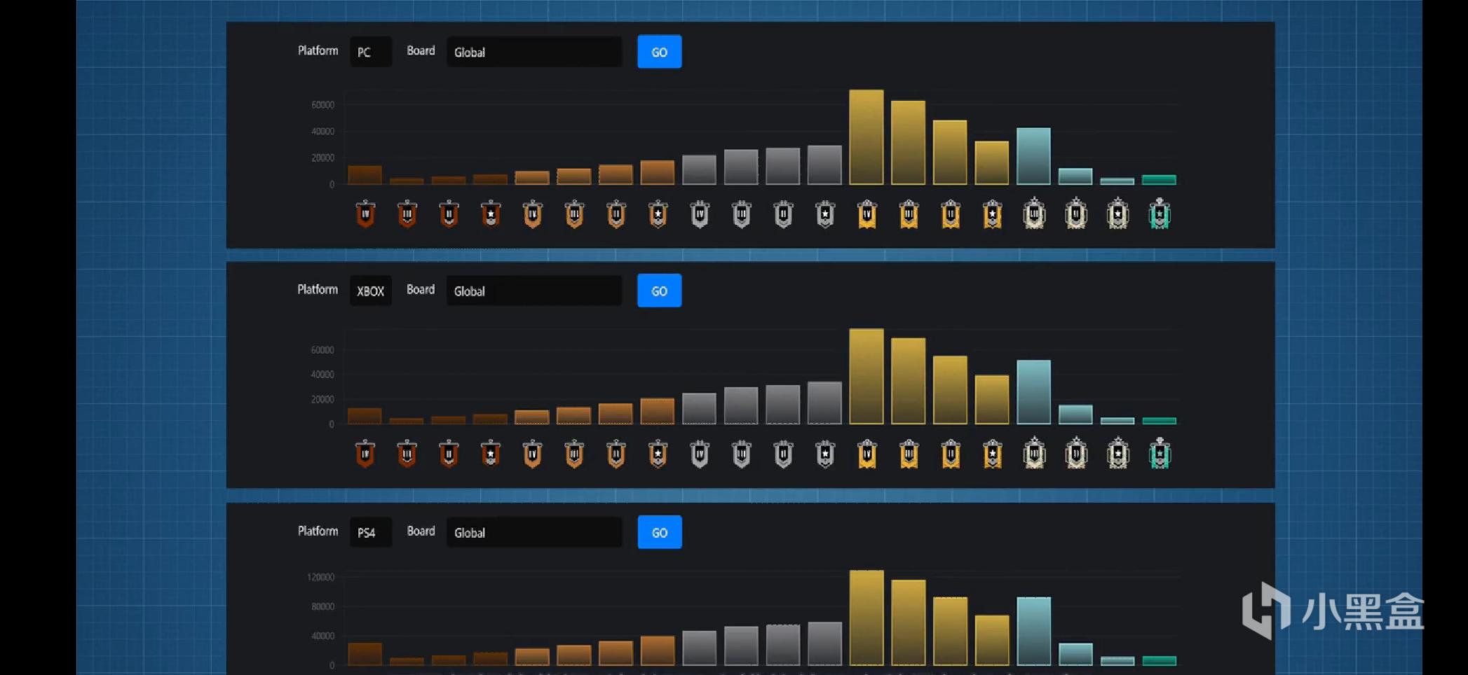 在赤鸦赛季官方公布了一张玩家段位统计图,可以看到它是标准的正态分布曲线,然而这是官方的假数据图(或者说是育碧理想的数据图)。