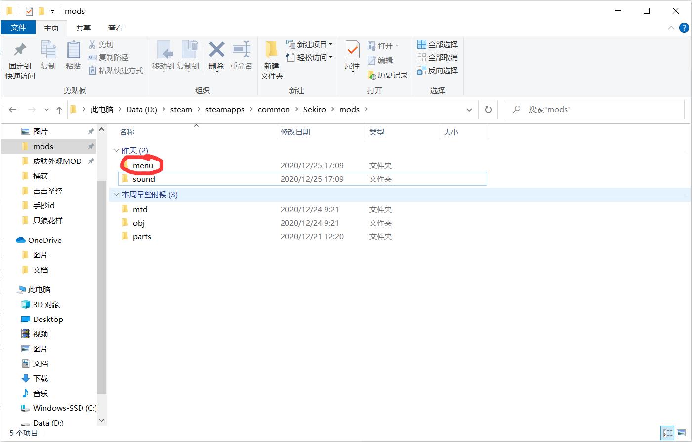 这个大伙应当也是看的不少,很多视频里,只狼死了都是显示“菜”或者“白给”,这都是使用了文字替换mod,这是在mods名下的一个名为“menu”的文件夹