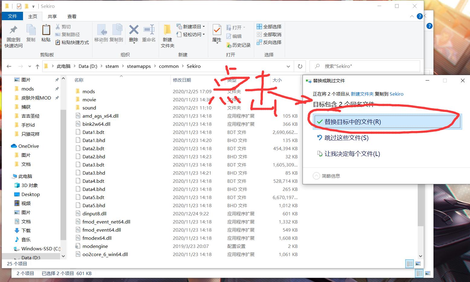 我们下好了这两个文件,就可以直接把他们装到只狼的根目录里面了,如果显示是否替换,我们直接点确定。