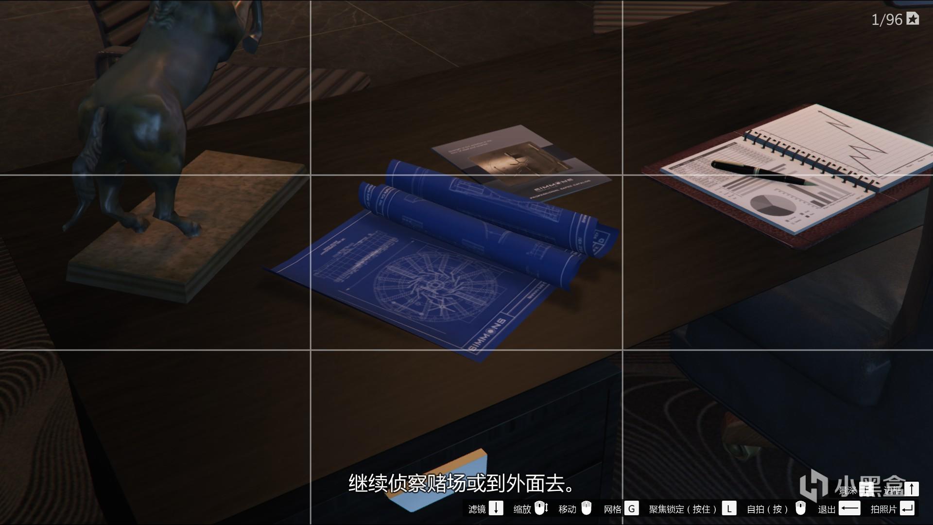 到此为止莱斯特已经提示最低侦查点达到了,但是想完成全侦查点还需要接着往里面走,上二楼走到贝克女士的办公室,办公室桌上有一个赌场结构的蓝图,对着蓝图拍照发给莱斯特。值得一提的是,想进入贝克女士的办公室需要赌场的VIP身份,不然是无法进入办公室的,最简单的办法就是买下赌场的空中别墅。