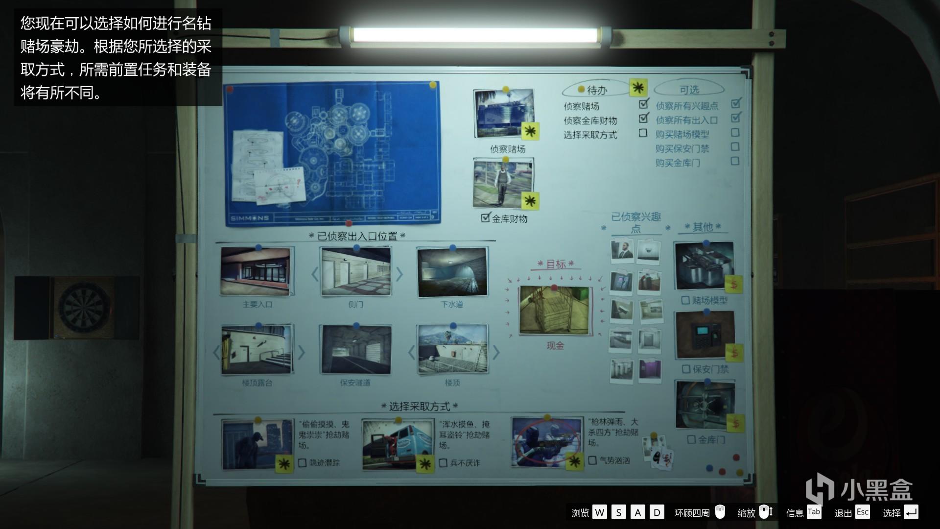 到此为止赌场的所有出入口和侦查点已经全部侦查完毕。除所有兴趣点外,在第二个准备任务侦查金库财物中通过监控侦查金库内金库大门还可以解锁购买金库大门模型。
