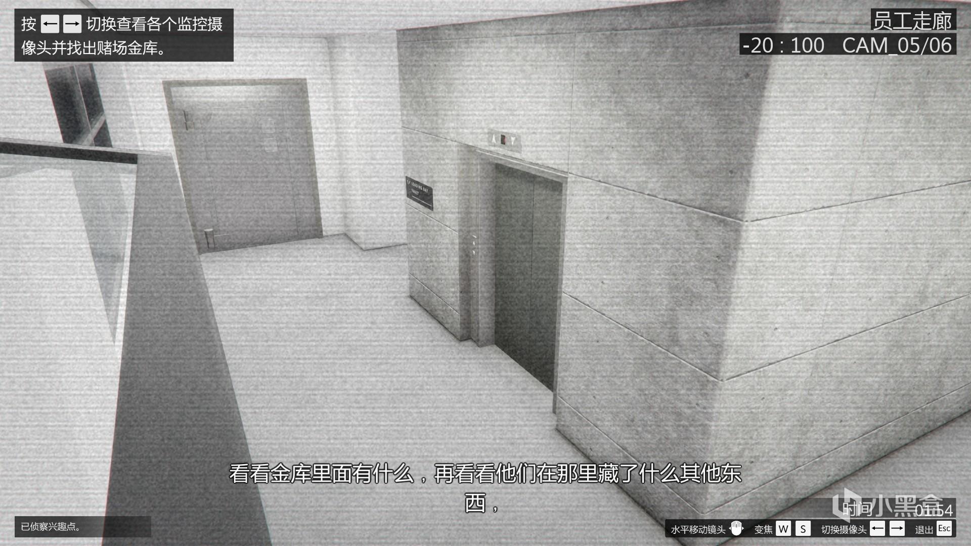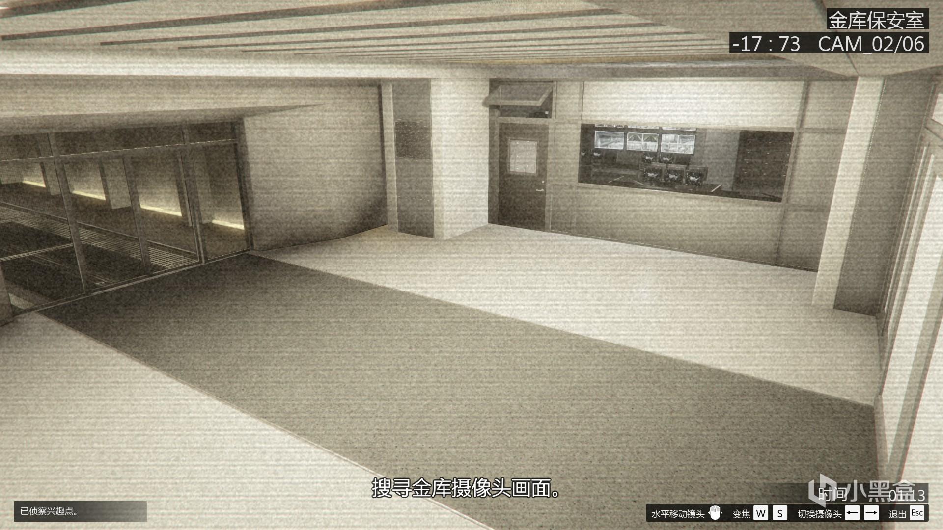 在第二个准备任务侦查金库财物中,我们可以侦查金库财物和剩下的5个兴趣点我们骇入监控后把每个地方都看到即可,通过方向键换监控,鼠标移动镜头即可,不需要拍照,会自动侦查兴趣点。