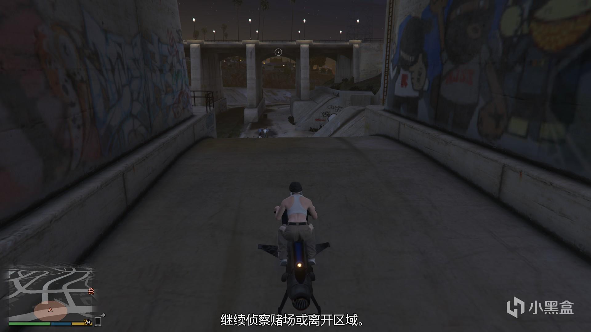 从停机坪下来后往后门的后面走,到达地图这个位置桥下有一个地下通道,是赌场的货运通道大门,对赌场的货运通道大门拍照发给莱斯特。