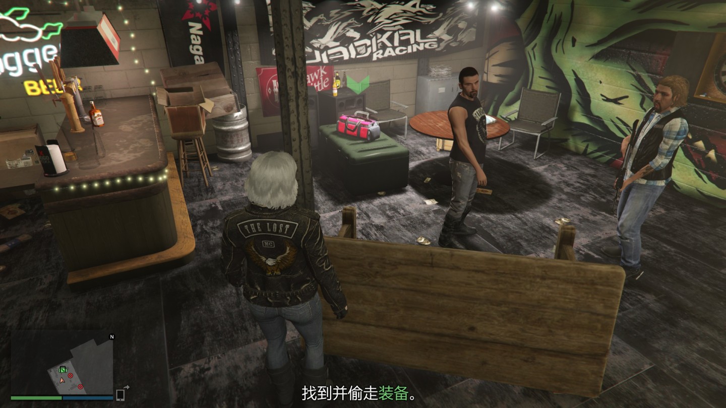 炸药通常是放在摩托帮的吧台附近,有很多摩托帮成员在旁边看着,准备好战斗就行。如果爆发冲突,先清理掉人再取包就行