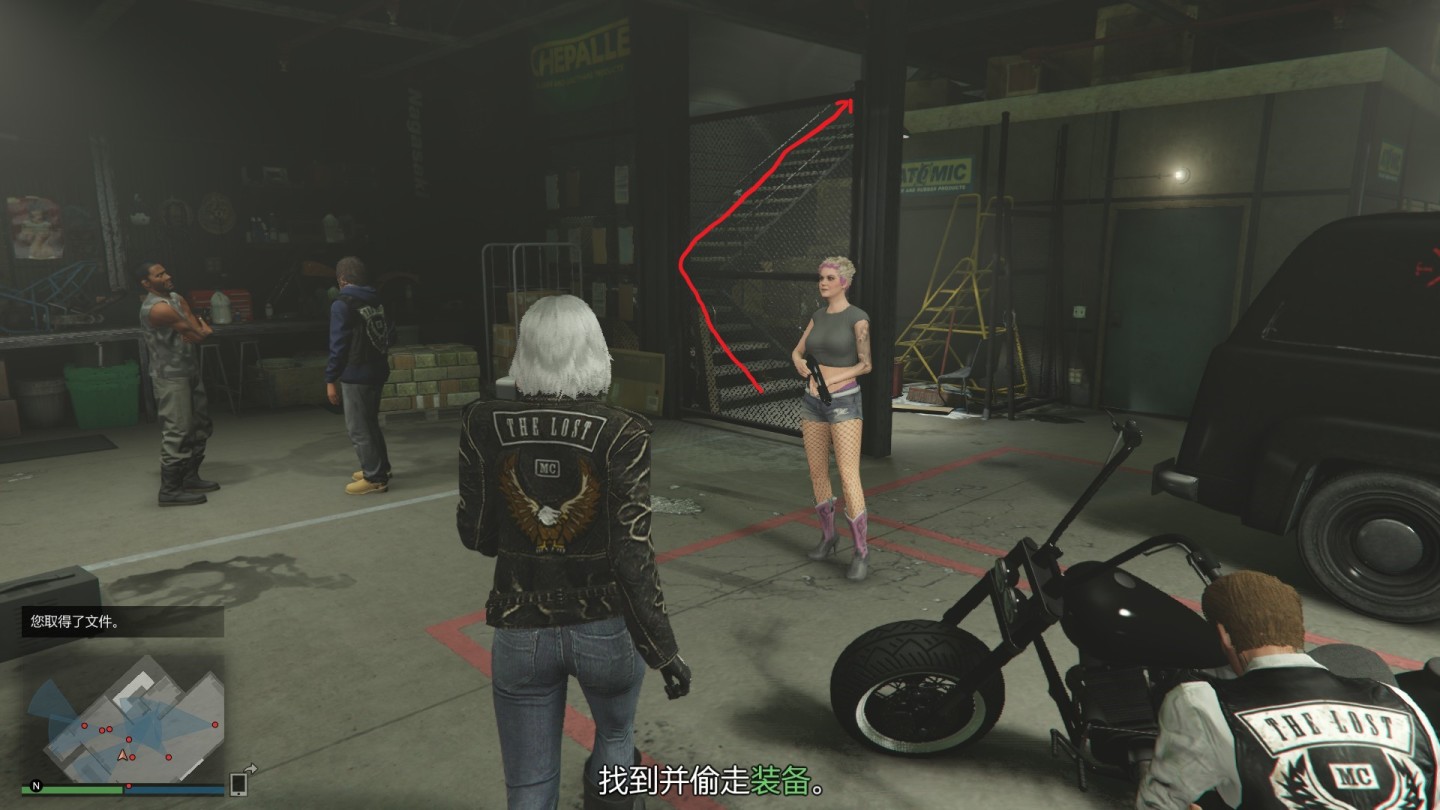会所内外都有大量的摩托帮成员,我们可以靠着这身套装安全混进去,但不能在敌人视野下待过长时间.而我们需要在会所内偷走记录实验室位置的文件、炸药